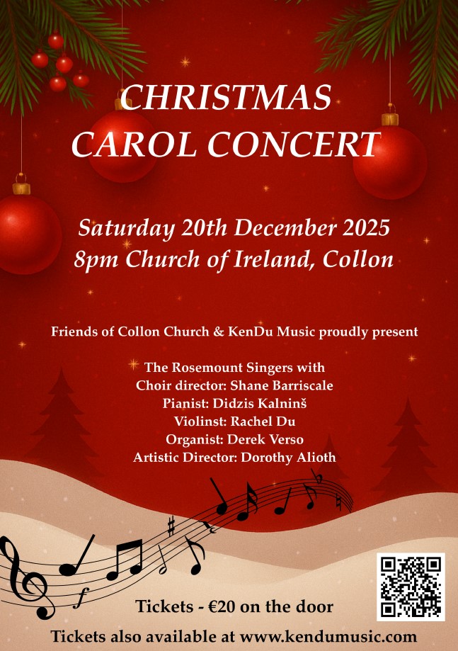 Friends of Collon Church are delighted to announce a concert in the Church of Ireland Collon on Saturday 20th December at 8.00pm, just a few days before Christmas.